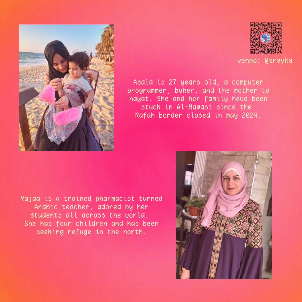 Back in September — in the pursuit of thinking creatively about mutual aid and putting money toward hobbies — I started taking Arabic classes online with a teacher in Palestine. Mistakenly, I assumed she was based in the West Bank, only to reveal that she was in North Gaza with her husband and four children — Waleed, Salma, Zaina, and Sarah. A pharmacist by trade, Rajaa started teaching Arabic online at the onset of the genocide, relying on solar panels to fuel her connection. She’s brilliant, with an inherent creativity when it comes to teaching language and a sense of humor that matches mine.